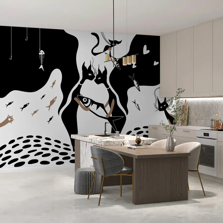 Transform any wall into a whimsical delight with this black and white cat mural featuring playful fish. It’s like a storybook scene, where two cats share a sweet moment over their favorite catch—talk about a cat's dream date! The bold lines and quirky style instantly grab attention, sparking joy and maybe a chuckle among guests. Picture it in a cozy living space, where every glance brings a smile, or perhaps in a playful child’s room, igniting their imagination. It's not just decor; it's a slice of fun that turns an ordinary wall into an extraordinary conversation starter. A purr-fect choice for cat lovers and art enthusiasts alike!