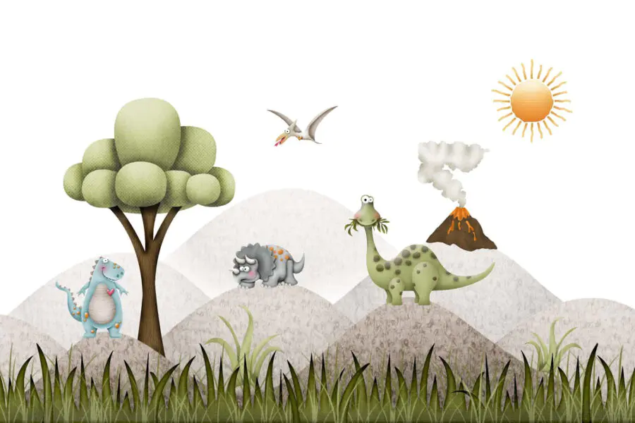 Transform any room into a prehistoric playground with this charming wall mural featuring cartoon dinosaurs frolicking in a whimsical landscape. Picture it: little ones giggling at the sight of a friendly T-Rex or the adorable brontosaurus munching on grass. The playful details, like the erupting volcano and soaring pterodactyl, spark imaginations and weave adventure into everyday life. It's a perfect backdrop for storytime or just hanging out. So, why not let these dino pals add a splash of fun and creativity to their space? They might even inspire some epic adventures—just maybe not to the Jurassic period!