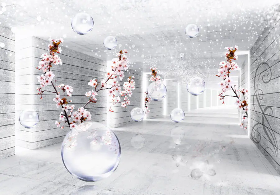 Wall murals White room with flowers and bubbles
