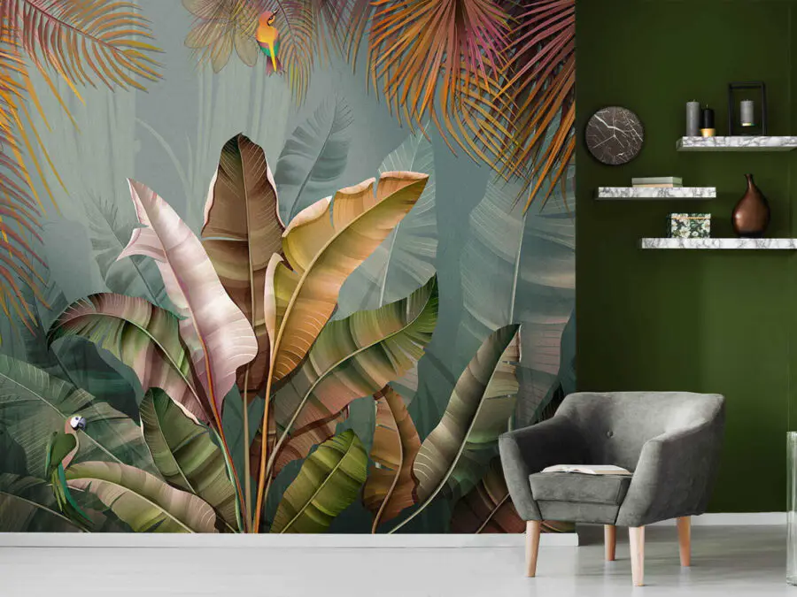 Bring a splash of the tropics into your home with this vibrant wall mural featuring lush foliage and playful bursts of color. Imagine your space transformed into a sun-drenched paradise, where every glance feels like a mini vacation. It’s like your walls are whispering secrets of a steamy jungle adventure! The rich greens mixed with warm hues can spark conversations and cozy vibes, making it perfect for any room. Whether you're sipping coffee or hosting friends, this mural sets the scene. Your walls will feel alive, and who knows—maybe a parrot will pop by to say hello!