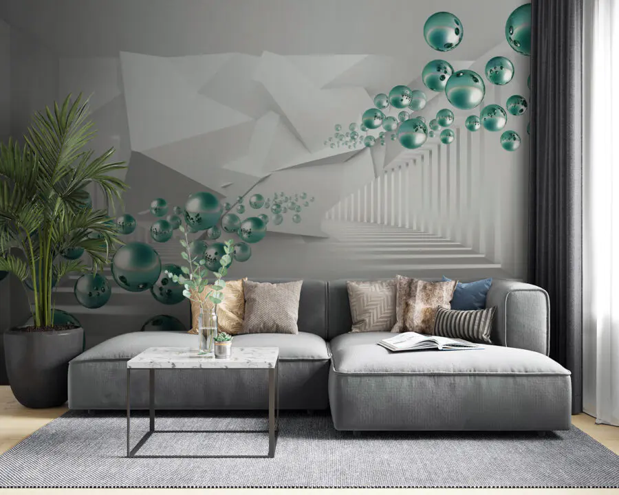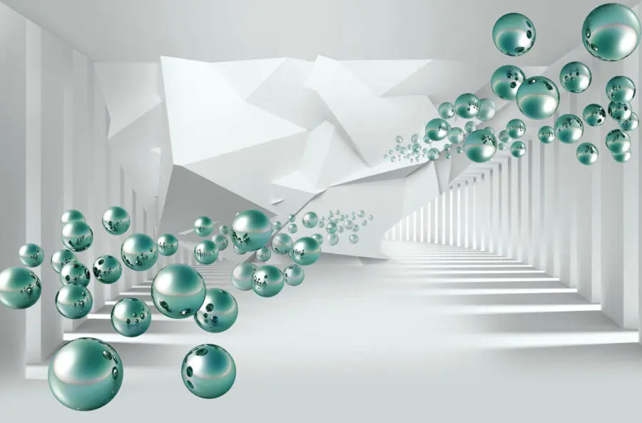 Step into a world of blissful minimalism with this mural, where shiny green balls dance among the crisp white walls and columns. It’s like a stylish art gallery – minus the snooty vibe. Picture sipping coffee in a space that feels fresh and fun, with a dash of intrigue. The way those playful spheres float might just spark daydreams about adventures beyond four walls. It’s not just decor; it’s an instant mood-lifter. Perfect for anyone looking to add a little whimsy to their everyday life while keeping things sleek and chic!