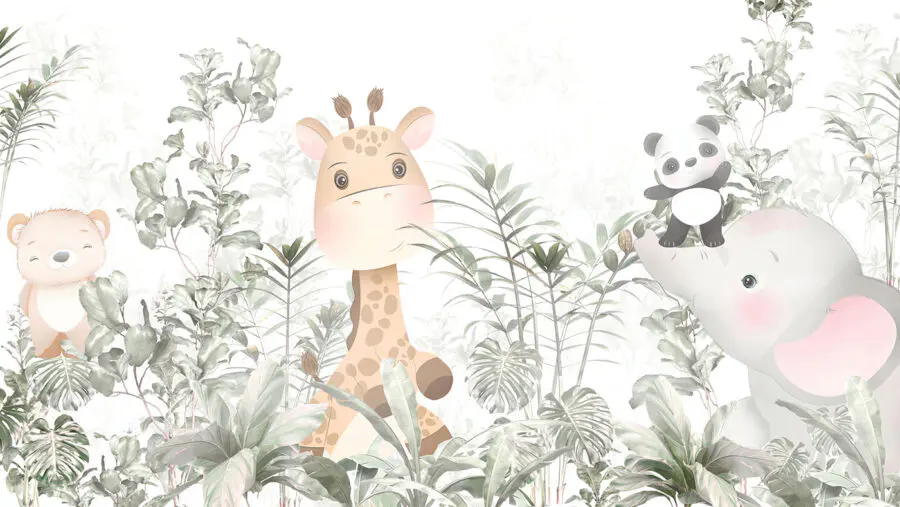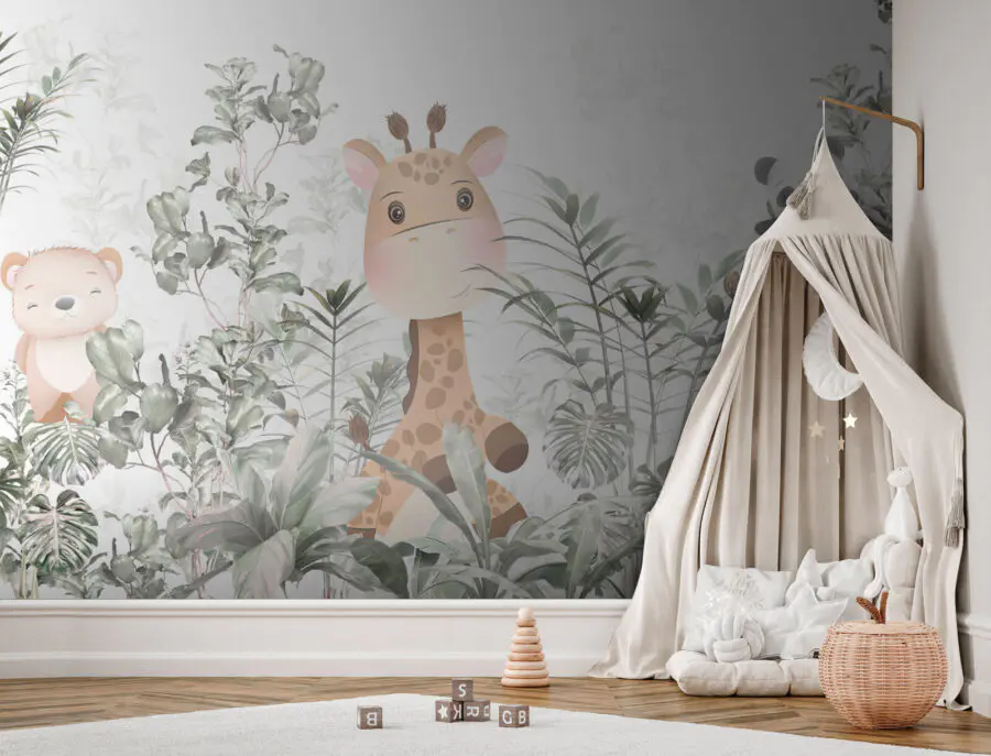 Imagine transforming your child's room into an enchanting forest with "Giraffe and Panda in a Forest" wall mural! It's like bringing a storybook to life—giraffes peeking through leaves, a panda riding on an elephant's back, and an adorable bear just hanging out. The softness of the colors and the detailed illustrations make you feel cozy and warm, like you've stepped into a peaceful jungle adventure. It'd be perfect for sparking a child's imagination—suddenly, bedtime stories aren't just words; they're all around them. Can't you just see your little one making up tales about their new animal friends? It's all about creating a magical vibe that'll make everyone feel like they're right there in the heart of the forest. Easy to love and even easier to look at, this mural's sure to put a smile on anyone’s face. Just pure, delightful charm hanging on your wall.