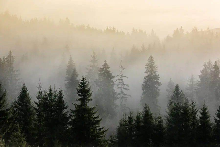 Wall murals Foggy forest with trees