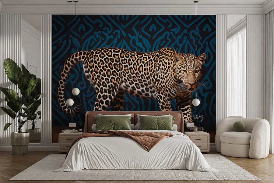 Imagine walking into a room and being greeted by a stunning leopard, poised and vibrant, just chillin’ on your wall. This mural isn’t just art; it’s a statement! The rich spots of the leopard contrast beautifully against the deep blue background, creating a sense of adventure without leaving your sofa. Picture it—friends come over, and instead of small talk, they’re mesmerized by this fierce yet graceful creature. The warm wood floor detail adds a cozy touch, making it feel like home, but with a wild twist. It’s perfect for animal lovers or anyone wanting to add a splash of boldness to their space. Trust me, this mural will have everyone saying, "Wow, that’s a conversation starter!" Who wouldn’t want a little bit of the wild side, right?