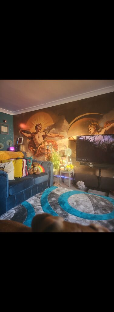 The wall mural is really beautiful, although there are a few areas that don’t fit together perfectly… Putting it up wasn’t too difficult, though you really have to be careful not to get glue on it, because it’s hard to clean. It’s also true that the ink from the design itself transfers when you keep running your hand over it to smooth it out.